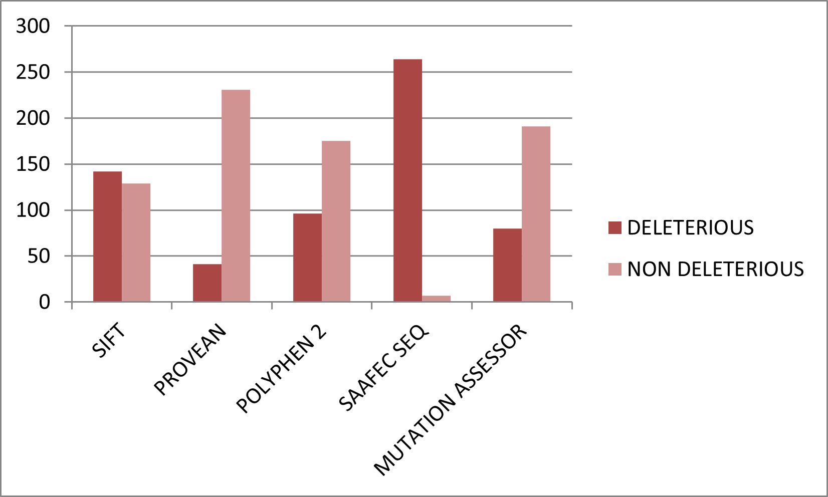 SIFT predicted 142 variants as damaging, PolyPhen-2 identified 96 as possibly or probably damaging, PROVEAN identified 41 as deleterious, Mutation Assessor identified 80 as functionally impactful, and SAAFEC-SEQ predicted 264 variants to reduce folding free energy.