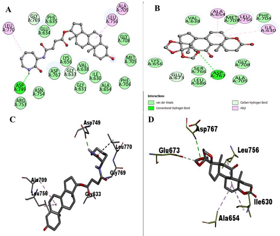 Interaction analysis emphasized hydrogen bonding, hydrophobic contacts, van der Waals interactions, and especially interactions with Lys656 and Asp749 in the ATP-binding pocket.