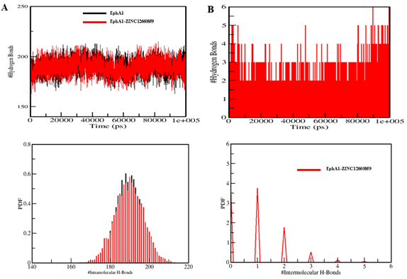 Molecular-dynamics simulation of the EphA1–ZINC12660859 complex over 100 ns supported stable binding and suggested that ZINC12660859 is a promising computational lead for EphA1-targeted anticancer discovery.